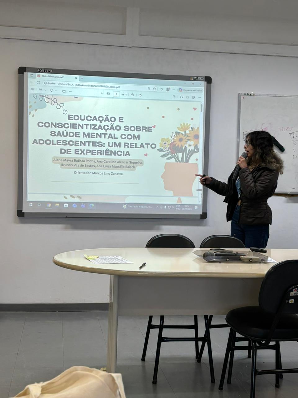 A acadêmica Alane Mayra Batista Rocha, do curso de graduação em medicina, apresentou o trabalho "Educação e conscientização sobre saúde mental com adolescentes: um relato de experiência" no Salão da Indissociabilidade, um dos eventos que compõe a MPU. O resumo teve a autoria dos estudantes Alane Mayra Batista Rocha, Ana Caroline Alencar Siqueira e Brunno Vaz de Bastos e da Profa. Ana Baisch (coordenadora do Cenpre e do atual projeto De Bem com a Vida), com orientação do Prof. Lino Zanatta. O trabalho apresentado relata a vivência destes acadêmicos no projeto de extensão De Bem com a Vida.