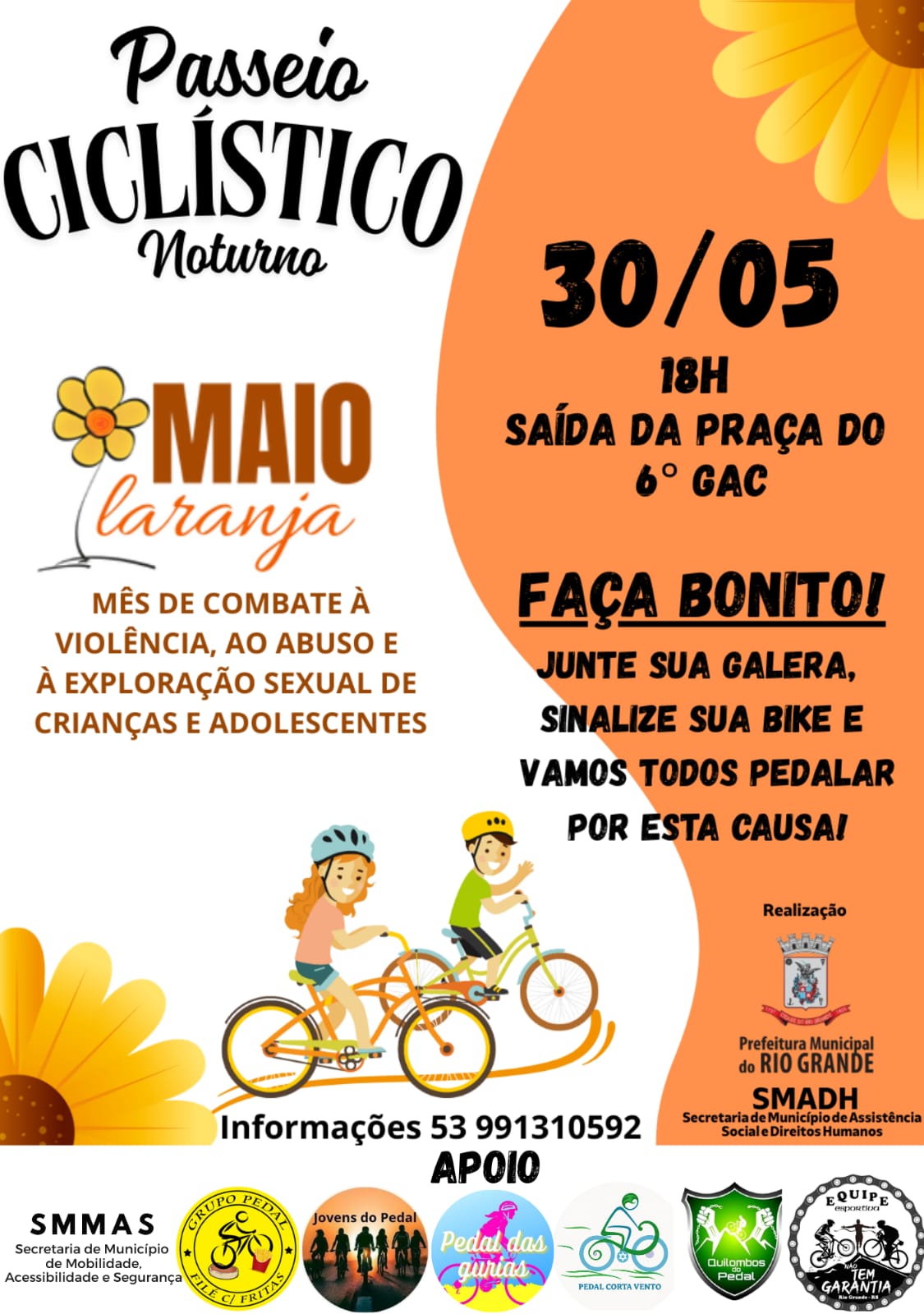E para encerrar o Maio Laranja - Mês da Proteção 2025, haverá o passeio ciclístico às 18h (atividade aberta ao público):