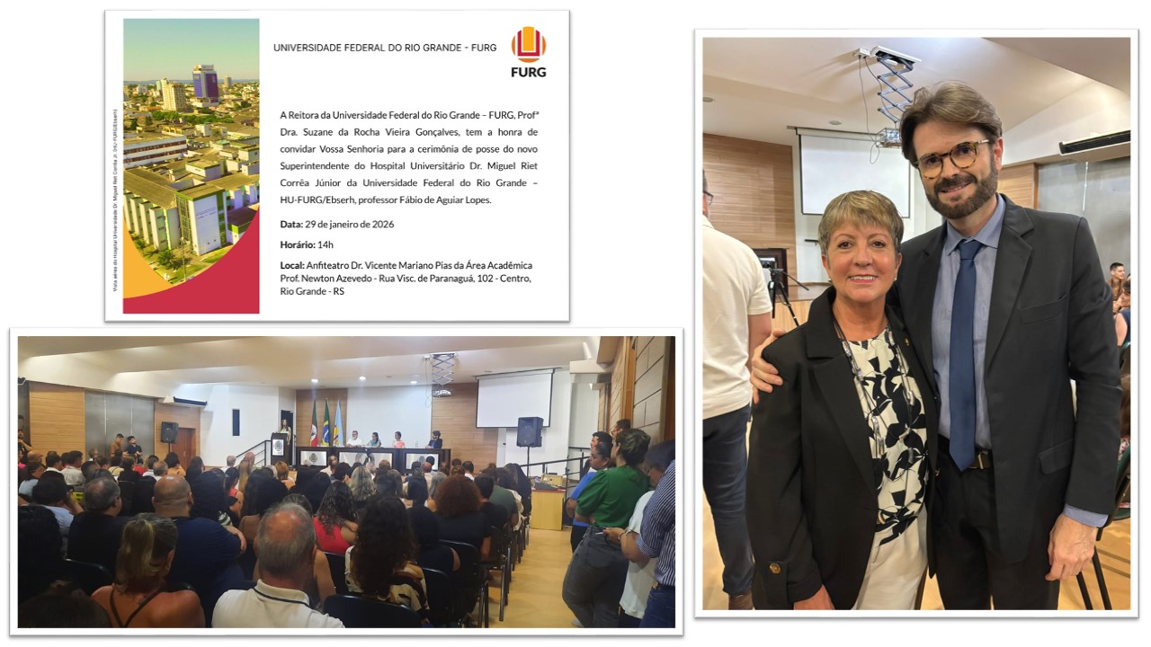 No dia 29 de janeiro de 2026, no auditório da área acadêmica do Hospital Universitário da FURG, aconteceu a cerimônia de posse do novo superintendente do HU, Prof. Fábio de Aguiar Lopes. Profa. Ana e Seiko estiveram presentes para prestigiar o momento.